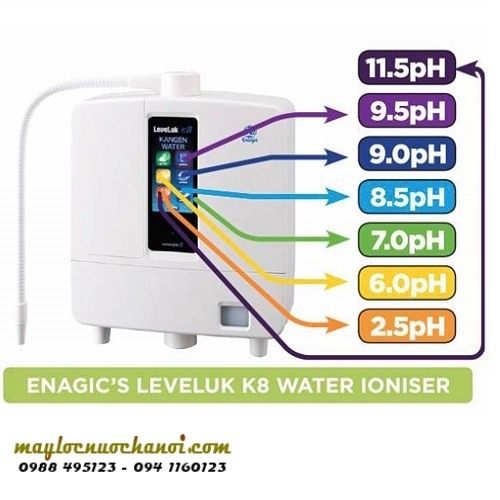 Máy lọc nước kangen K8 là một chiếc máy rất tuyệt vời có khả năng sản xuất chất chống oxy hóa nhiều và giữ được lâu nhất trong các dòng máy điện giải hiện nay! Máy điện giải nước ion kiềm K8 tạo ra một dòng liên tục cho ra 5 loại nước đa năng để đáp ứng tất cả nhu cầu thương mại đa năng của bạn: Nước Kangen mạnh, Nước Kangen®, Nước có tính trung tính, Nước để làm đẹp và Nước có tính axit mạnh ( giúp khử khuẩn).